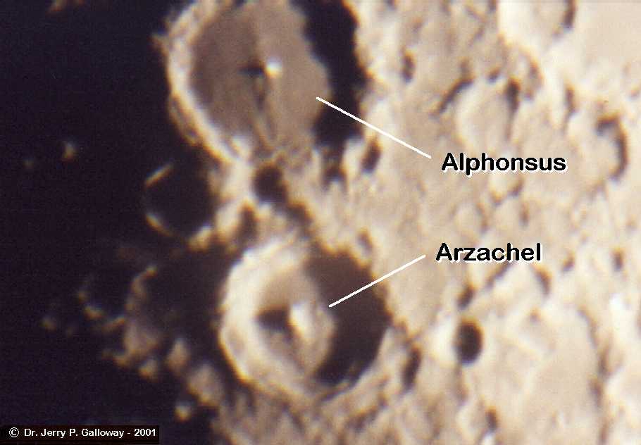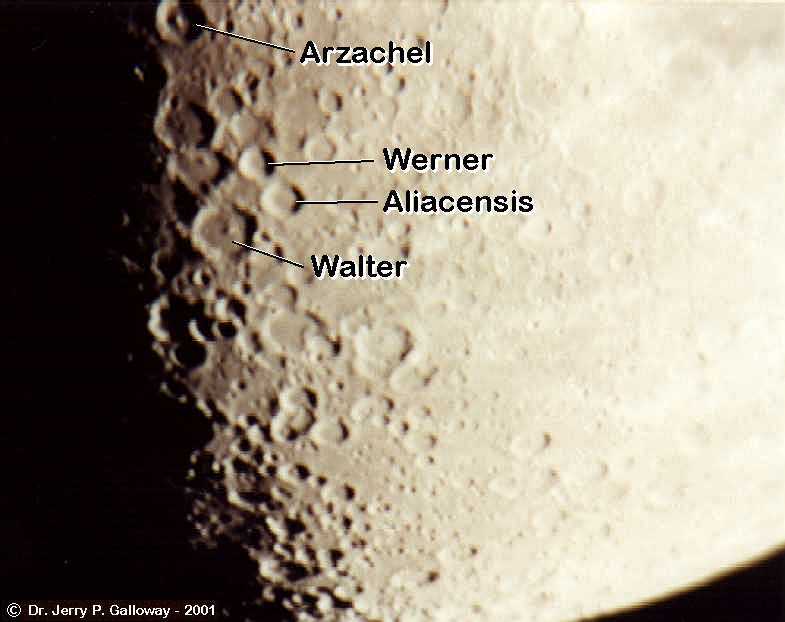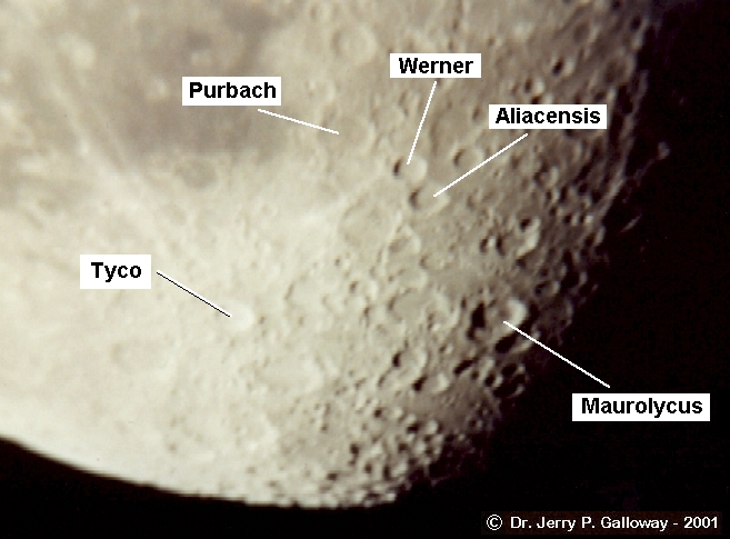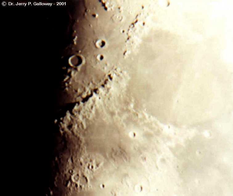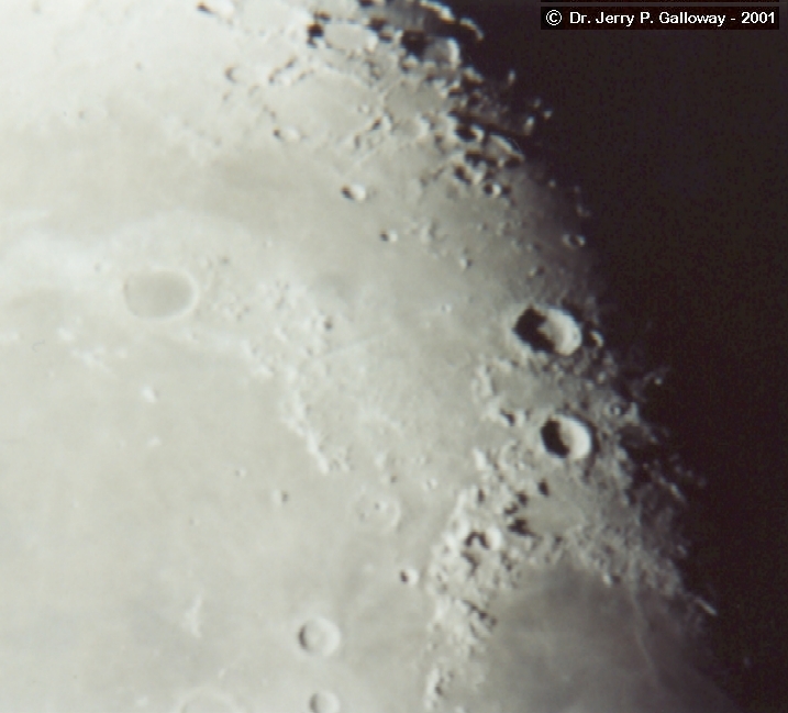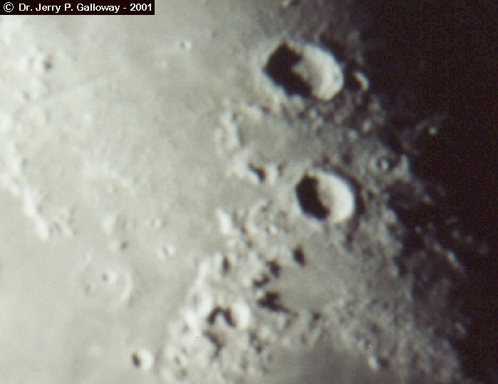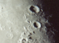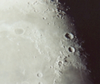 Moon Craters Part of my best photos at the time. The camera is Pentax Automatic. Film: Kodak 100 speed Date: 07-11-01 4:30am At home: Valparaiso, Indiana I used Eyepiece Projection with my 26mm plossl Telescope: LX200 - 10" f/10 converted to f/6.3 1/2 second - approx. 65X |